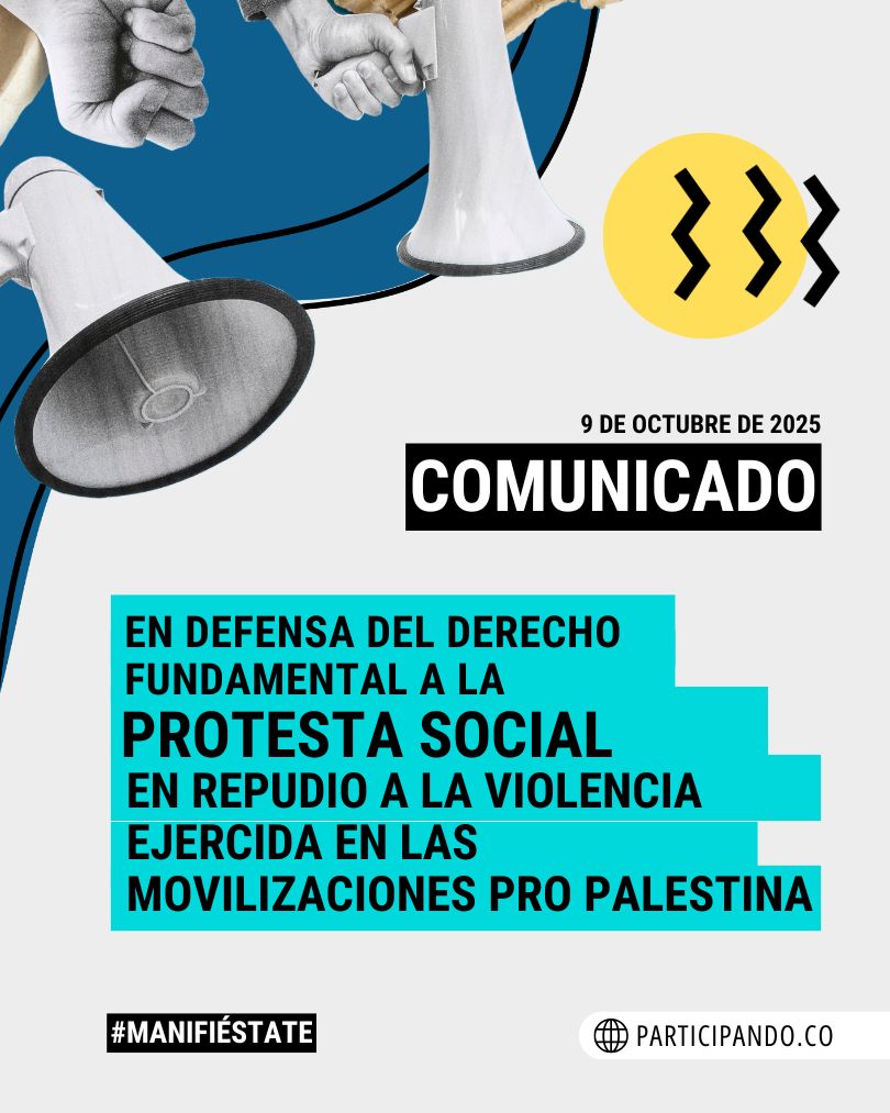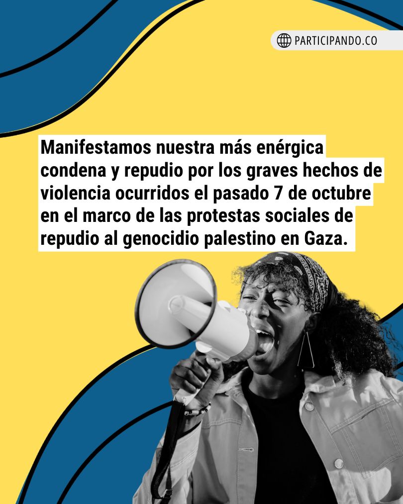 Las organizaciones y ciudadanía abajo firmantes dirigimos este comunicado a la opinión pública nacional e internacional, a los organismos de derechos humanos y a los gobiernos locales del Estado Colombiano para manifestar nuestra más enérgica condena y repudio por los graves hechos de violencia ocurridos el pasado 7 de octubre en el marco de las protestas sociales de repudio al genocidio palestino en Gaza.
